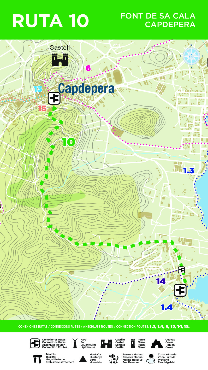 Esta ruta conecta Sa Font de Sa Cala y Capdepera, cruzando las montañas que las separan, disfrutando de la flora y la fauna más autóctonas. Desde sa Font de sa Cala, el recorrido se inicia en la playa en dirección a Capdepera por la calle principal y a unos 500 m, a la altura de na Taconera, tomamos a la izquierda recorriendo las calles del Xiprell, primero, y de s'Arbocera, después, conduciéndonos a un camino o sendero que nos asciende hasta el collado de s'Heretat, con algunos tramos de dificultad que requieren la indumentaria y calzado adecuados. Una vez en él se obtienen unas vistas espectaculares de toda la comarca, especialmente del castillo y la costa. El ascenso/descenso desde/a Capdepera se realiza por las calles desde/hacia la plaza de l'Orient.