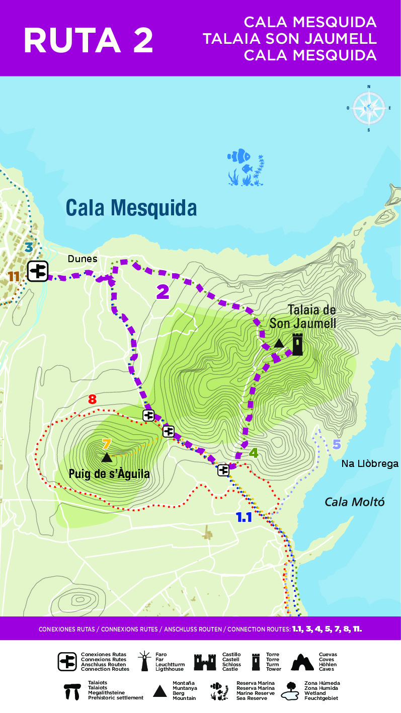 Ruta circular. Se inicia desde la playa de Cala Mesquida, atravesando la pasarela de madera, entre las dunas. Continuaremos hasta llegar al muro que nos separa con la zona de Son Jaumell, donde tomaremos a la izquierda un pequeño camino, a partir del cual seguiremos los hitos indicativos, ascendiendo por la cara norte de la montaña de Son Jaumell, hasta la atalaya, que ofrece una panorámica única. (El ascenso tiene algunas rampas con cierta dificultad y el terreno es muy rocoso). Una vez en la atalaya se nos presentan dos opciones para el descenso: desandar el camino anterior o hacerlo por la cara oeste de la montaña, que nos llevará al Coll de Marina (ruta 1.1). Una vez en él tomaremos a la derecha, en dirección a Cala Mesquida.