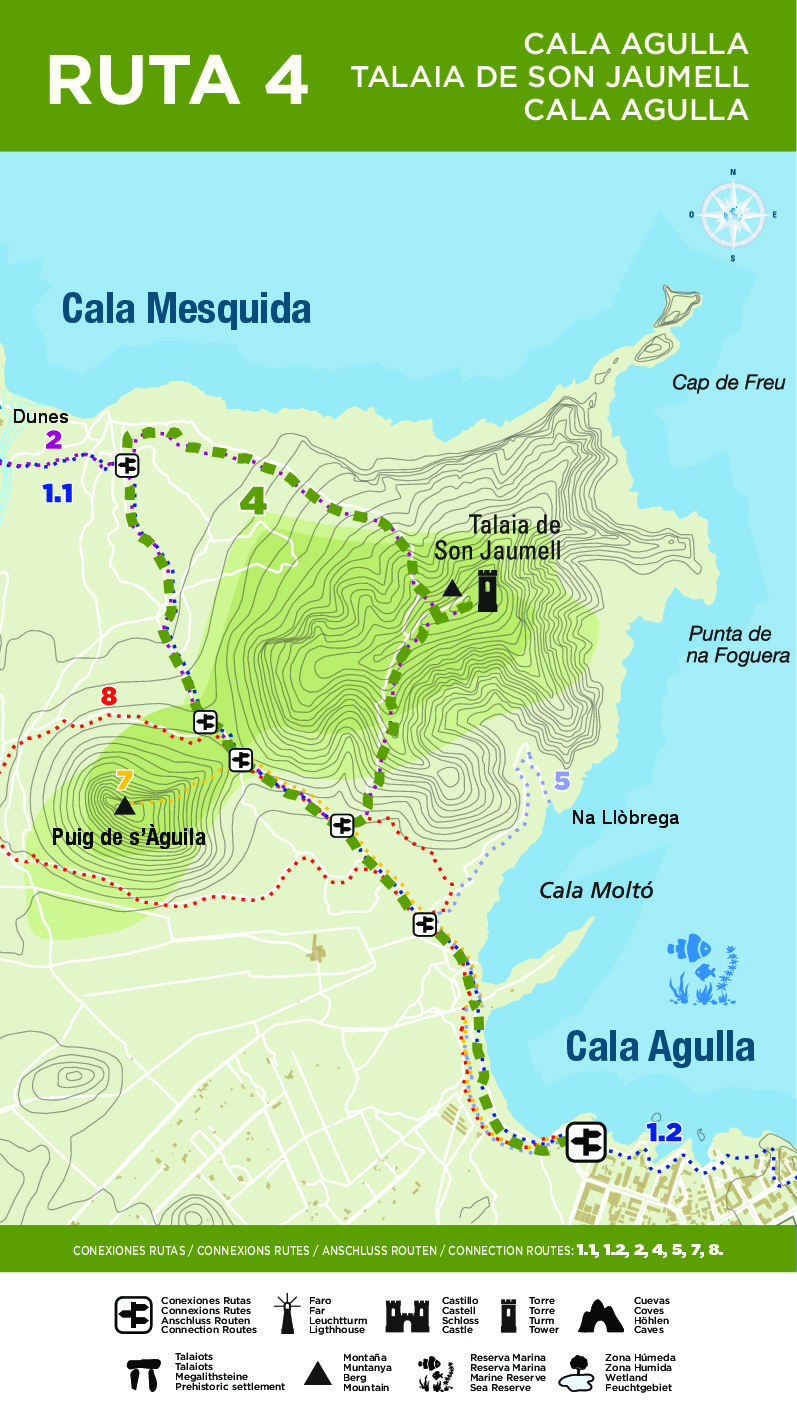 Ruta circular. Desde la rotonda de Cala Agulla cruzamos toda la playa hasta la zona de pinar del fondo. Subimos por el camino del Coll de Marina, dejando a nuestra derecha Cala Moltó, de aguas cristalinas. A unos 500 m encontramos un desvío hacia la derecha, e iniciamos el verdadero ascenso por el interior del bosque, hasta llegar a la Talaia de Son Jaumell. Ya de regreso, por la cara norte, el primer tramo de descenso tiene algunas rampas con alta dificultad. Es imprescindible, pues, el uso de calzado de montaña. El bello sendero de bajada nos dejará ante la playa de Cala Mesquida. Y una vez ahí, tomaremos el camino de la izquierda, por el que llegaremos de nuevo a Cala Agulla por el mismo Coll de Marina